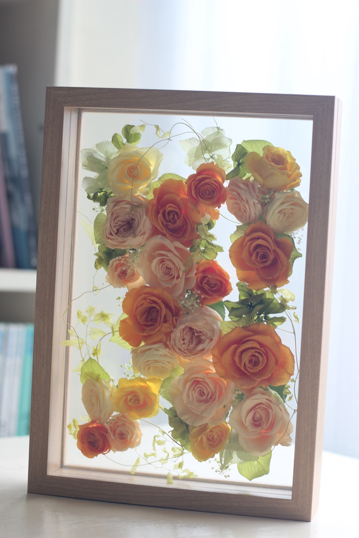 職場の皆様で、お渡しになられましたプリザーブドフラワーの額装アレンジです。