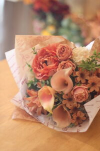 お誕生日のお祝いにとオーダーいただきました、アーティフィシャルフラワーの花束です。50代の女性用で、派手すぎず、ちょっと華やかに。