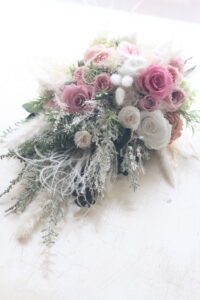 プリザーブドフラワーでお祝いの花束をお作りしました。優しいイメージの女性用です。