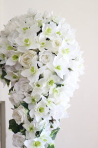 新郎さん新婦さんのお二人で1日かけて作られたブーケはなんと膝下にまで流れるキャスケードブーケ。