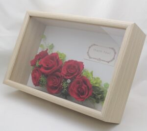 還暦お祝いのアレンジもオーダーいただくことが多くあります。プリザーブドフラワーが記念品として人気があるようですね。