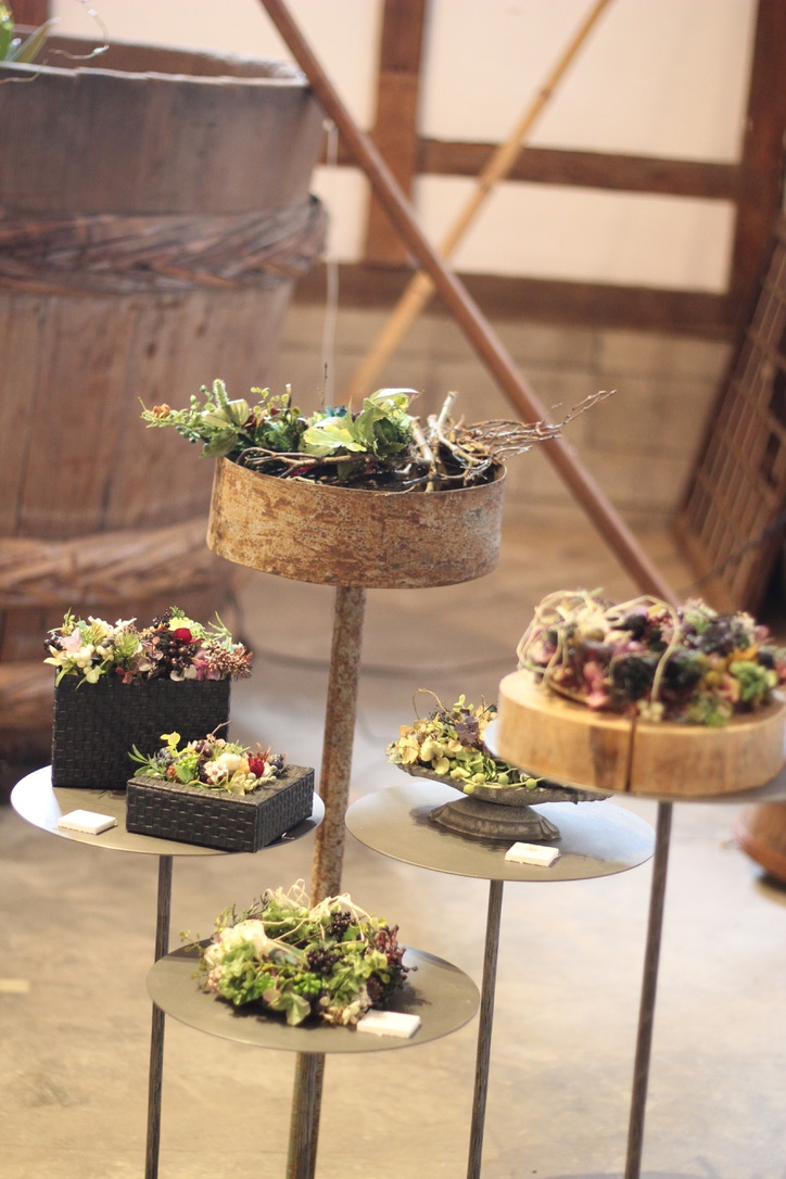■和のコーディネートも可能です。その場を意識した装飾をします■ 文化財である酒蔵での和花のディスプレイ。野花や枝物のアレンジは和風になり過ぎずデザインします。生花で制作しました。 -