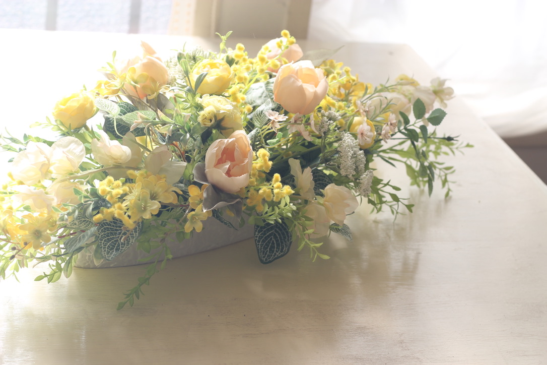 リビングへと見通しの良い使い空間が広がるキッチン周りフラワーアレンジ(群馬県桐生市個人宅)